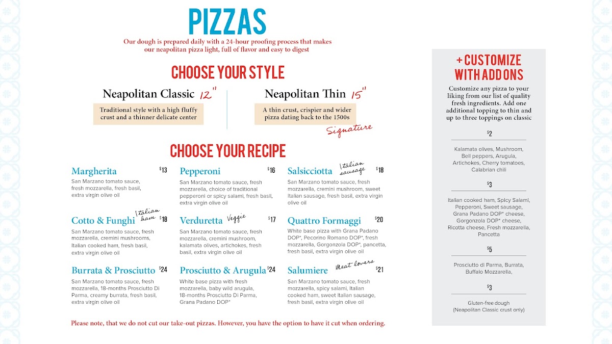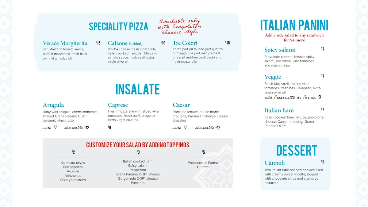 Starting with their Neapolitan Signatures, the TRE COLORI Three Part Pizza stands out as a culinary masterpiece. With one-third Quattro Formaggi, one-third classic Margherita, and a delightful nut-free basil pesto with fresh mozzarella, it's a feast for the senses at just $20.50. For those who prefer a heartier option, the CALZONE, filled with ricotta cheese, fresh mozzarella, and Italian cooked ham, enveloped in rich San Marzano tomato sauce, offers a comforting embrace, also at $20.50.